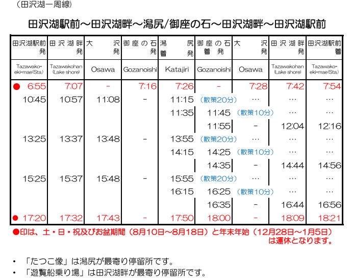 田沢湖駅からは、湖を一周するバスが運行されており、これを利用して観光しました。「たつこ像」や「御座石神社」のバス停では、10〜20分ほど停車してくれるため、ゆっくり観光を楽しむことができます。