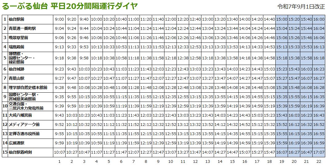 仙台城跡へは地下鉄やバスで行くこともできますが、時間があったので往路は徒歩で向かうことにしました。約40分ほどの道のりで、最後の仙台城前の急坂はなかなか大変でした。復路は市内を巡回するバス「るーぶる仙台」で仙台駅へ戻りましたが、巡回型のため少し時間がかかりました。