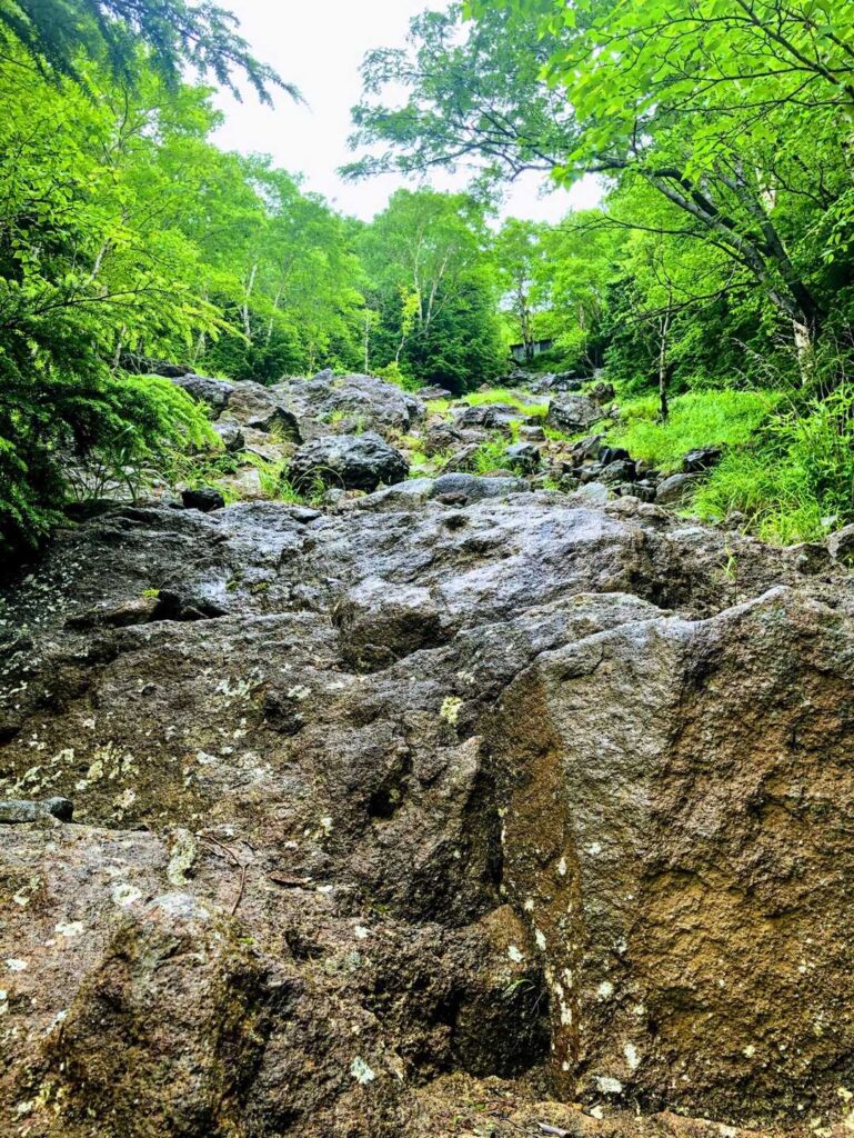男体山の頂上付近の茶色い石に敷き詰められた地面と