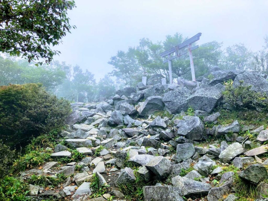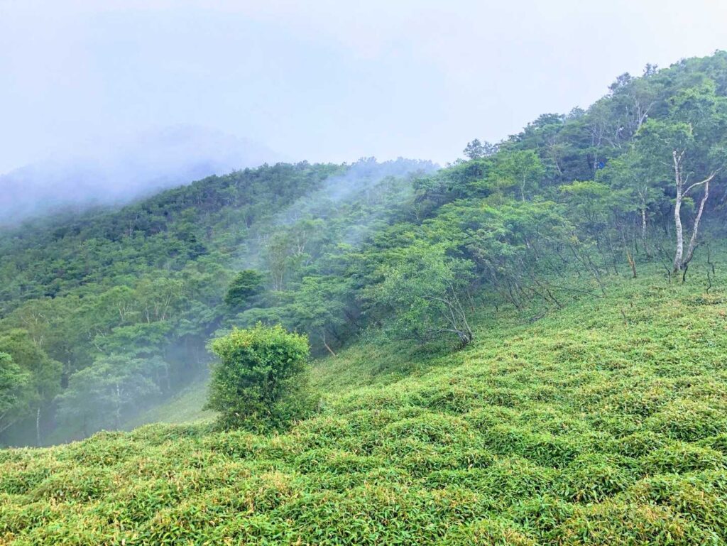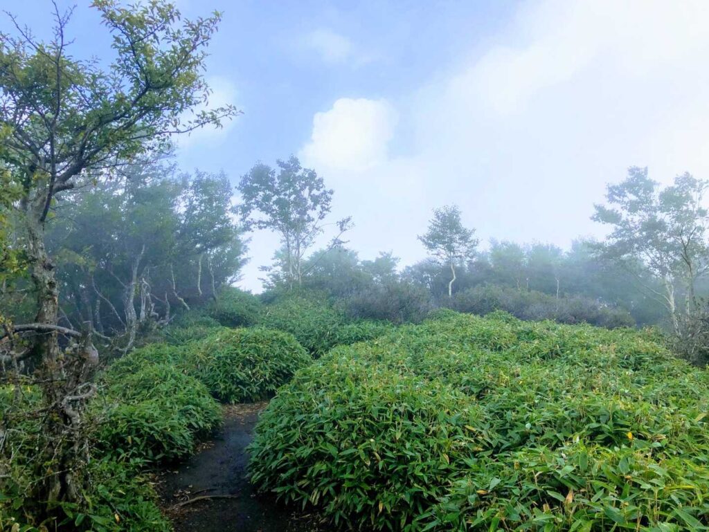 絶景は諦めていましたが、黒檜山の山頂で休んでいると、ほんの一瞬、雲がさーっと流れて下界の景色が現れました。周りにいたみんな大興奮でした。こういう一瞬はうれしいですよね!