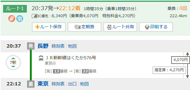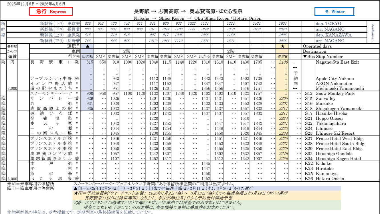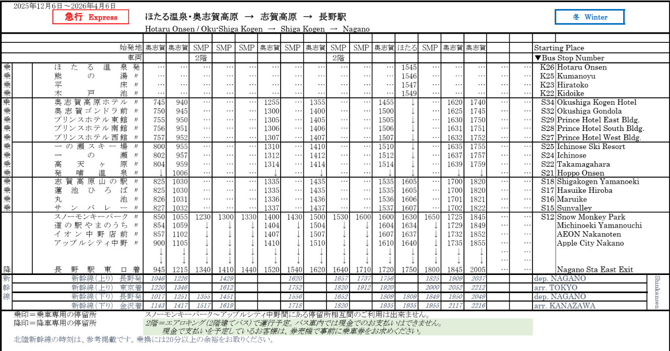 一ノ瀬スキー場 17:55 → 長野駅東口 20:05