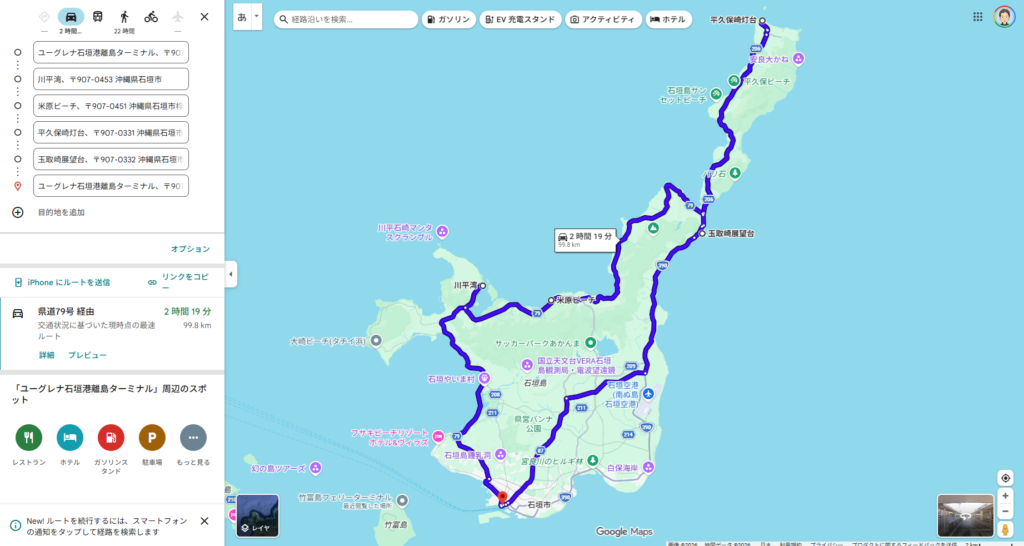 石垣島は一周が約140kmほどで、車で約3〜4時間あれば回ることができます。