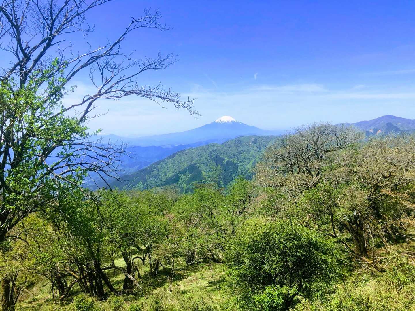 頂上の少し手前から撮影 さっきより手前の山が低くなったので、左右の裾野が下まで見えます!